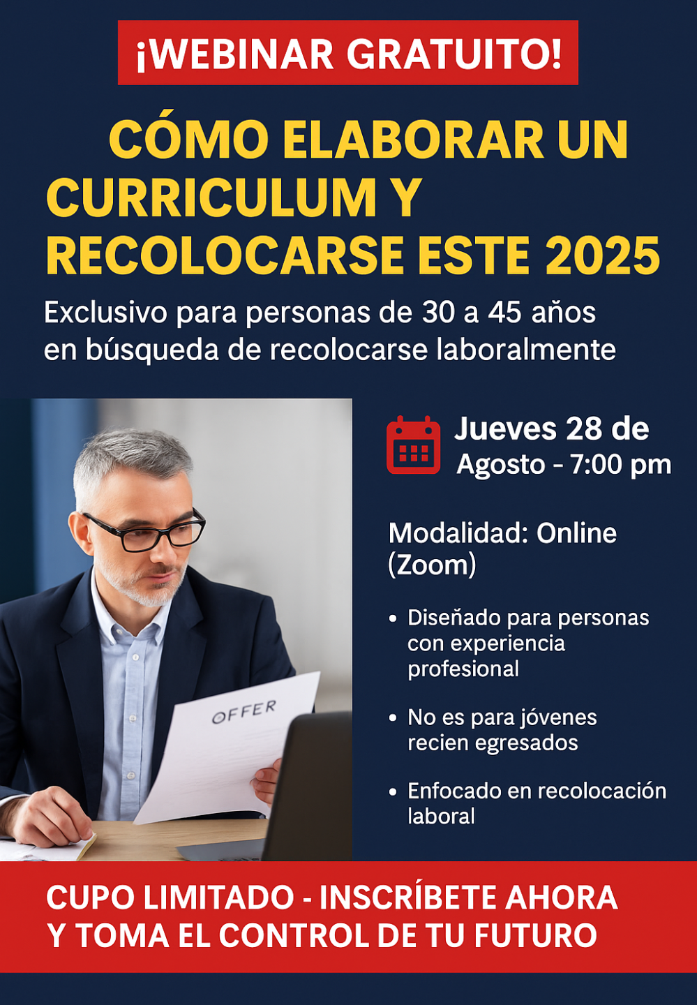 Un evento EN VIVO totalmente GRATUITO, diseñado especialmente para profesionales en proceso de recolocación que buscan destacar en el competitivo mercado laboral.